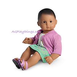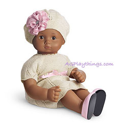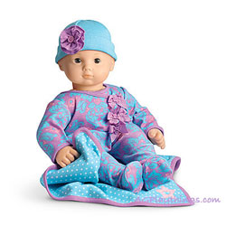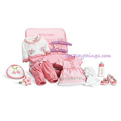 Deluxe Layette Set Fill her Bitty Baby doll's nursery with love! This 11-piece mix-and-match set includes everything your girl needs to care for her little one: A gingham dress with embroidery and eyelet lace at the hem. A knit cardigan with scalloped trim and embroidered details. Knit pants with a gingham sash and bow. White tights with sweet rows of eyelet ruffles. Pink shoes with a trio of rosettes at the toe. A soft star rattle with rings for shaking. A bottle for feeding time. A soft bib with star-hearts that dangle from green ribbon. Two fabric-covered hangers to keep her clothes neat and tidy. A satin suitcase that fits everything inside, featuring an inner pocket for organizing and a handle for carrying. Aug 2013 |