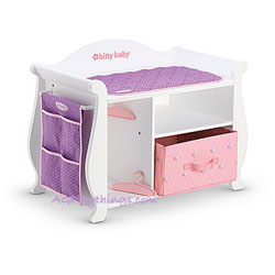 Wooden Changing Table & Storage When Bitty Baby needs a little TLC, this charming changing table is the perfect place to be! Made of wood, it's painted creamy white to brighten the nursery, and features two shelves for storing diapering supplies. It also comes with: A soft changing pad. A hanging storage caddy with pockets. A fabric drawer to hold nursery supplies. Two plastic hangers to keep outfits neat and tidy. Aug 2013 |