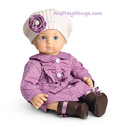 Dotty Coat Set for Dolls This perfectly purple coat will keep Bitty Baby cozy! It's printed with polka dots and features a Peter Pan collar, plus belt and button details. Includes soft-soled boots with ribbon trim and a sweater-knit hat with a pretty rosette. Aug 2013 |