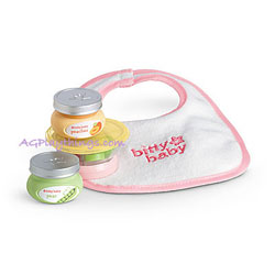 Mealtime Set Your girl can keep her Bitty Baby doll happy with this make-believe snack set. It features jars of peas and peaches, a snack container, and an embroidered bib. Aug 2013 |