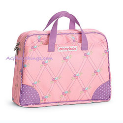 Bitty's Diaper Bag Your girl can take Bitty Baby doll's necessities on the go with this diaper bag. It features a diamond "quilted" print, polka-dot corner patches, a pair of carrying straps, and exterior pockets for storage. Plus, the bag can zip open to become a changing pad! Aug 2013 |