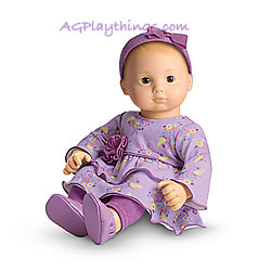 Purple Posies Outfit for Dolls Bitty Baby is ready for playtime in this cute purple outfit! It features: A tiered knit top with a delicate posy print and a fabric rosette at the waist. A headband with a bow. Stretchy leggings. Soft-soled shoes with star-heart embroidery. Aug 2013 |