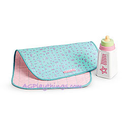 Bottle Time Set Your girl can keep her Bitty Baby doll happy and healthy! This feeding set includes a make-believe bottle and a reversible burp cloth—pink on one side, floral on the other. Aug 2013 |