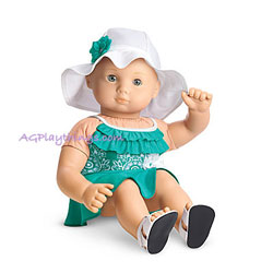 Ocean Blossoms Swim Set for Dolls Her Bitty Baby doll can't wait to splash and play in this swim set! It features: A turquoise blossom-print swimsuit with ruffles at the neckline and crisscross straps in back. Matching swim skirt has a pretty white rosette that sits off-center. Floppy sun hat with a flower decoration shades her eyes and face. Sweet white sandals complete her look. Includes the Bitty Bear's Sprinkler Splash book for girls. Feb 2013 |