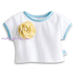 Basics Rosette Top Her Bitty Baby doll will be cute and comfy in this sweet and simple knit top. It features: A white tee with blue satin elastic binding at the neck and sleeves A cut-edge oversized rosette in a pretty yellow print adds a touch of color. Feb 2013 |