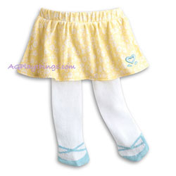 Basics Skirt & Tights Her Bitty Baby doll is ready for play in this one-piece skirt, tights, and "shoes" combo. It features: A yellow floral-print knit skirt with sewn-in tights. Tights are finished with blue "ballet shoes" at the feet. Feb 2013 |