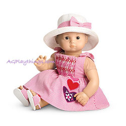 Little Hearts Outfit for Dolls Her Bitty Baby® doll can be a real sweetheart in this adorable dress, featuring pink and white stripes, a smocked bodice, and felt heart appliques at the skirt. She can shade her eyes with a wide-brimmed hat trimmed with a pretty bow, then add peep-toe shoes with hearts to match. Includes the Bitty Bear's Valentine Hearts book for girls. Jan 2013 |