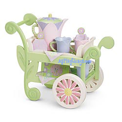 A tea cart with flower wheels that really work and a removable tray to store everything until next time