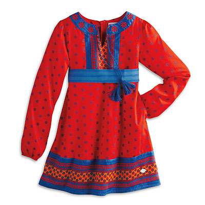 Desert Flower Dress for Girls Bold as the desert sky! Inspired by Josefina, this red tunic-style dress pops with brilliant blue flowers dotting the fabric. The hem is accented with a bright border print to match the woven tie sash at the empire waist. The long, blousy sleeves have elastic at the wrists. Tasseled neck ties and pretty blue embroidery at the neckband evoke a fun boho-chic look. Back zip. Cotton. Imported. Red. Sizes 6-16. |