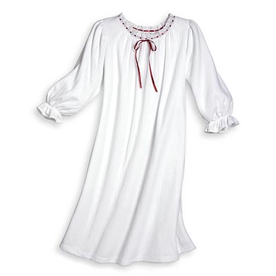 Josefina's Night Shift for Girls Like the one Josefina wore on her New Mexican rancho in 1824, this night shift has pointelle shadow stripes, puffy sleeves, and a lace collar threaded with berry-red ribbon. Flame-resistant polyester. White. Sizes XS (6), S (7-8), M (10-12), L (14-16). |