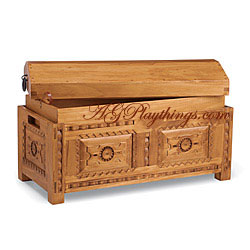 Josefina’s Chest II Josefina’s wooden chest is carved on the front and sides with heavy, rustic hardware—just like a traditional New Mexican trunk. The mortise and tenon joints are fashioned like they would have been in 1824. There’s plenty of storage space inside and a removable tray on top that’s just Josefina’s size. W: 23 1/2" x H: 12 1/2" x D: 11". |
