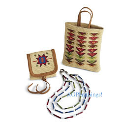 Kaya’s Accessories Item# WMA $20 Item# D8631 $24 Kaya’s bag and belt pouch hold food and other treasures. She might have woven them using cord dyed with berries, wildflowers, and mosses—the same dyes that would have colored the porcupine quills in her pretty necklace. The woven patterns on the bags are only printed on the outside; the colors are not actually woven in the fabric. |