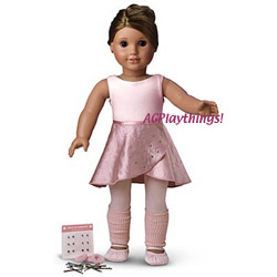 Marisol’s Tap Outfit Sometimes it’s all about the performance, so get Marisol ready to sizzle onstage in this long-sleeved leotard with a hot-pink fringe skirt, fishnet tights, and tap shoes with real taps on the bottom! Grab her glittery top hat and cane, straighten her bowtie, and get ready for the curtain call! $26 GYOD discontinued 2005 |