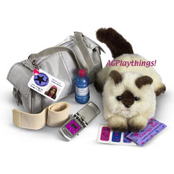 Marisol’s Dance Duffle & Cat Marisol loves to be on the go, and this silvery dance tote keeps her ready for anything! Tuck her fluffy cat in along with her dance necessities, like elastic bandages for sore ankles, stick-on bandages for blisters, an energy bar for snacking, and a water bottle to keep her hydrated. To stay on time and in touch, her cell phone flips open to a built-in clock that really works—batteries included! And just in case she ever leaves her trusty tote behind, a photo ID tag with a tiny charm clips right on to the zipper pull. $24 GYAP discontinued 2005 |