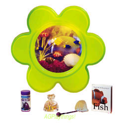 Six tropical fish, Flower-shaped LIGHTED aquarium with reversible backdrop,