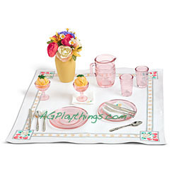 Glassware & Linens Set a festive table for Kit’s special day. Start with a printed linen tablecloth and two napkins. A bright bouquet in a ceramic vase makes a perfect centerpiece. Surround it with two plates, sherbet cups with make-believe sherbet, knives, forks, and spoons, then pour two glasses from a pitcher of pretend punch! $58 QBAC Retired Dec 2007 |