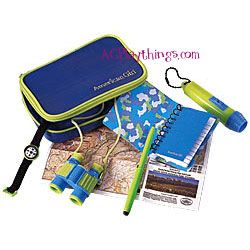 Camp Survival Kit This kit contains everything your American Girl needs to explore the great outdoors. Binoculars, a map, and a working flashlight and compass help her find her way through the woods. Back in her tent, she can record the day’s adventures with a journal and pen. Everything fits inside a mesh case! |